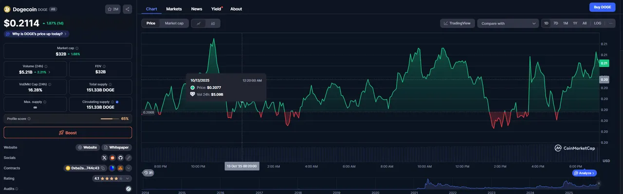 Drie rode dagen op rij, en de markt verloor in totaal $380 miljard aan waarde. Altcoins zoals DOGE en XRP kregen de zwaarste klappen, met dips tot 50% in seconden. Maar hé, crypto is veerkrachtig: zondag kwam de eerste groene candle, met DOGE die van $0,18 opsprong naar $0,214 en de 200-daagse SMA op $0,206 doorbrak.